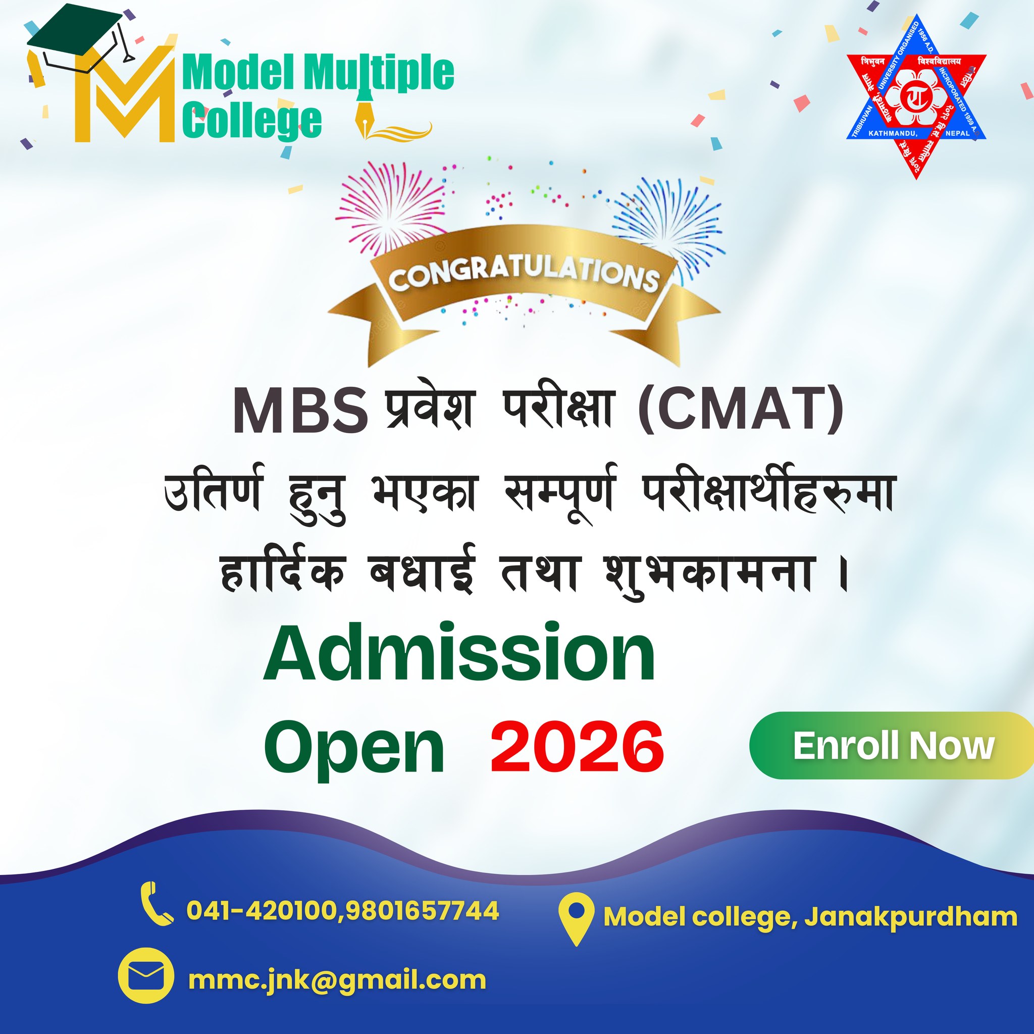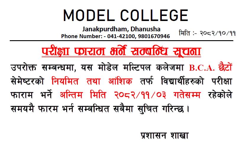 Model Multiple College, located at the heart of Janakpur, stands as a reputed center of academic excellence committed to delivering quality education in a dynamic and supportive learning environment. With a legacy of more than 27 years, the college has consistently contributed to the development of competent, skilled, and responsible individuals who have succeeded in diverse fields such as medicine, engineering, bank...